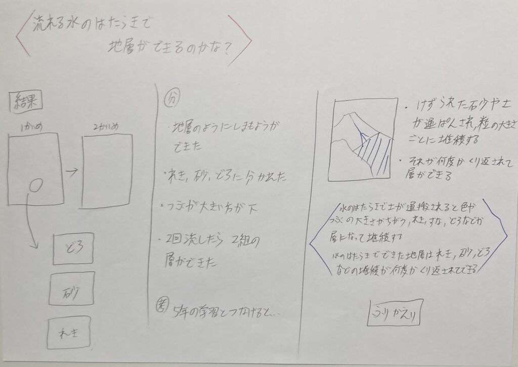 といって本時のまとめとして「水のはたらきで土が運搬されると色やつぶの大きさが違う、れき、すな、どろなどが層になって堆積する。水のはたらきでできた地層はれき、すな、どろなどの堆積が何度か繰り返されてできる」と書きました。