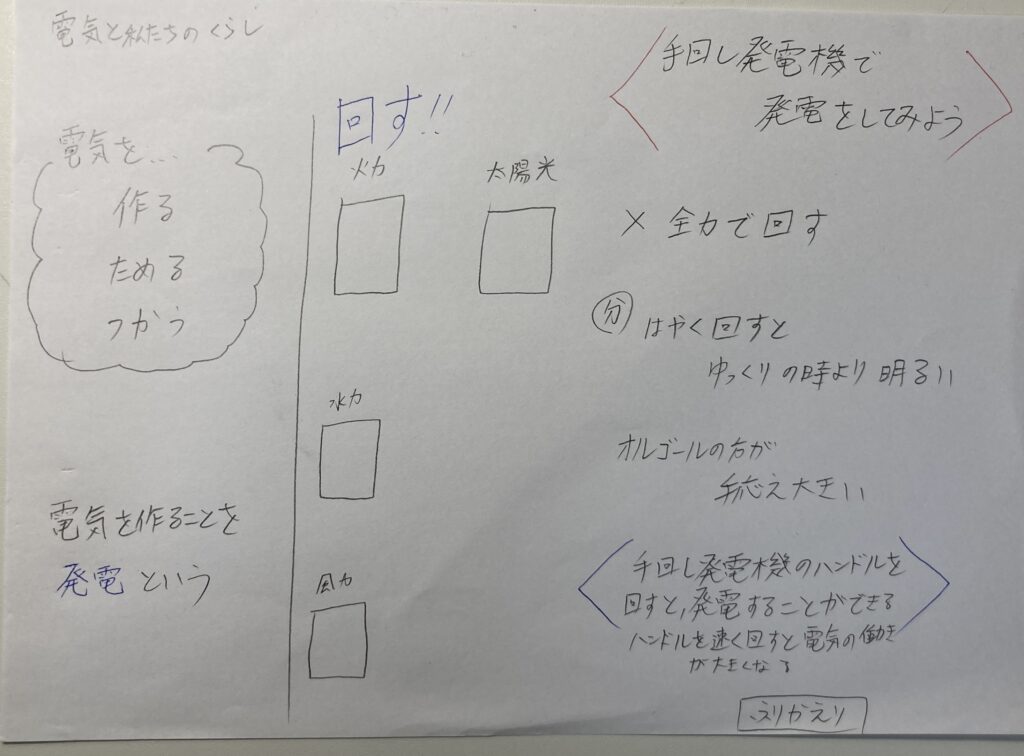 といって本時のまとめとして「手回し発電機のハンドルを回すと、発電することができる。ハンドルを速く回すと電気の働きが大きくなる」と書きました。
