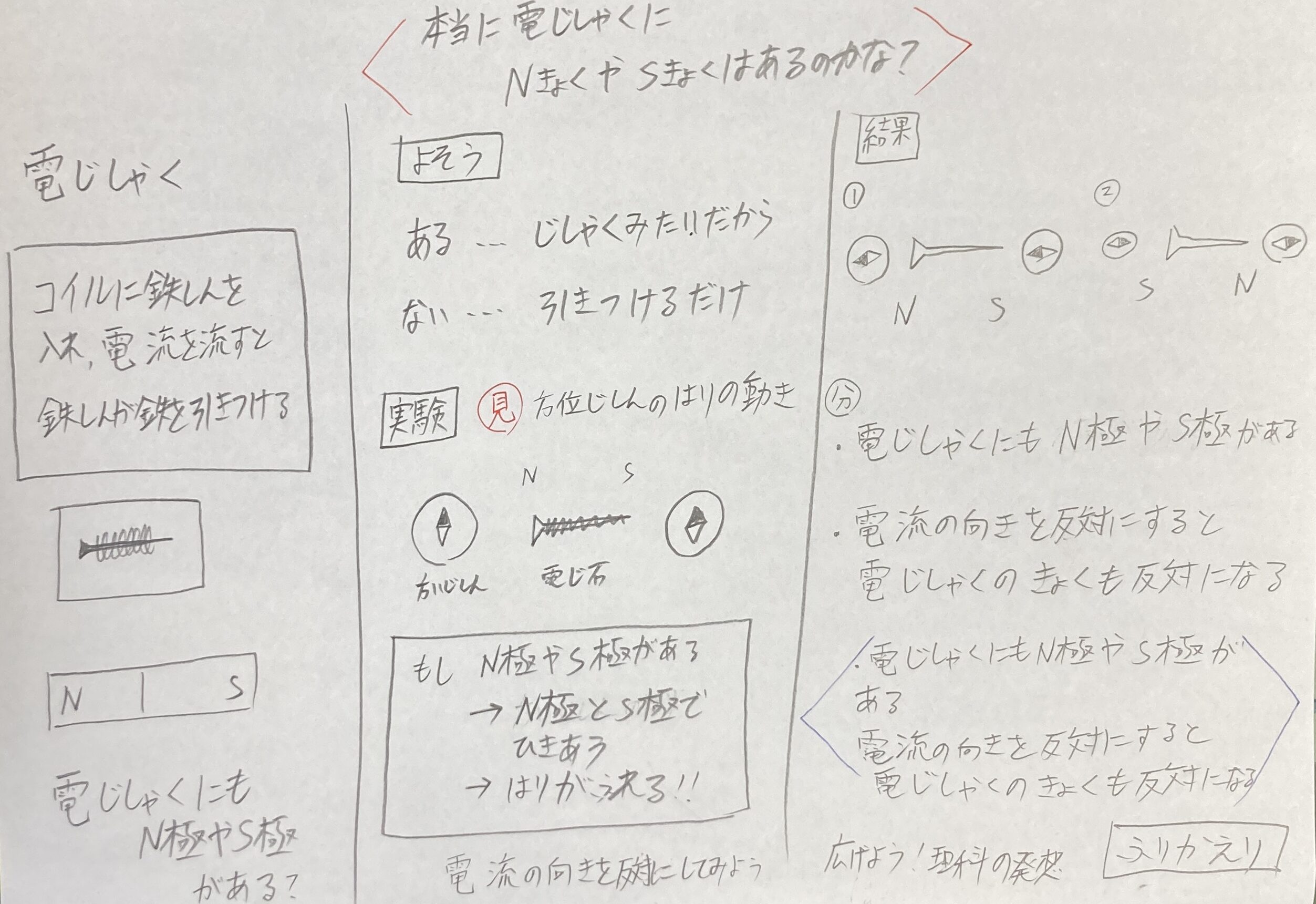 今回は、実験の前の見通しをもたせることが大事だと思います。写真をみて、「もし極があるならどういう結果になるのか」っていう結果の見通しをもてると実験方法をイメージできるようになります。そして、これがあるからこそ、その実験の意図をつかめて、子どもも理解できるというわけです。