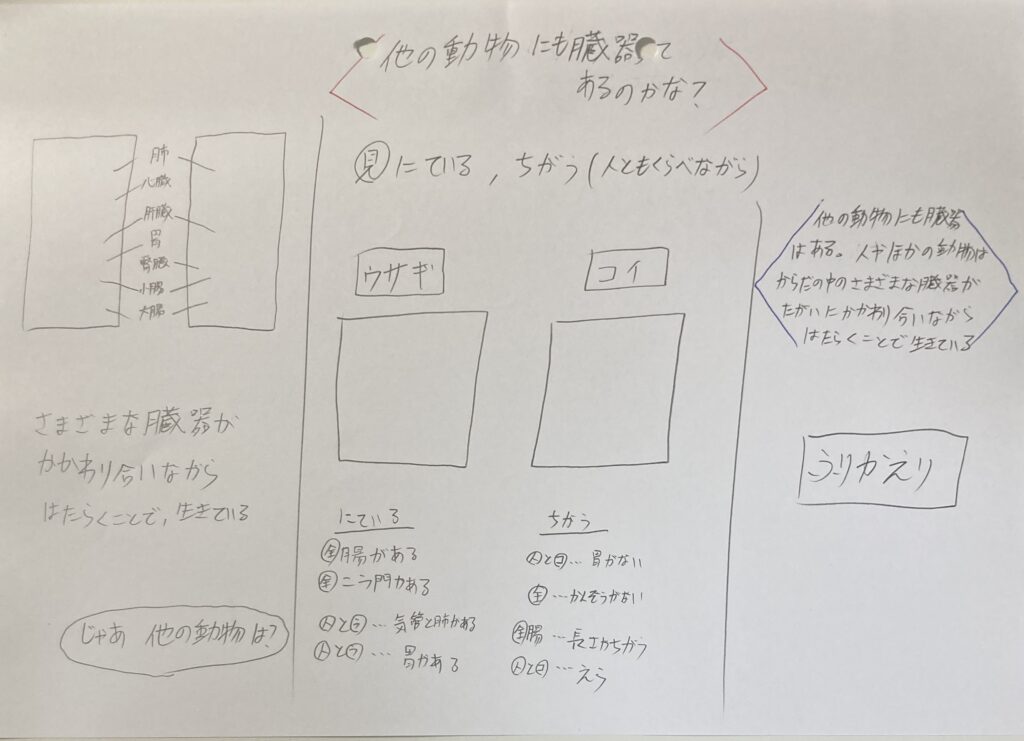 といって本時のまとめとして「他の動物にも臓器はある。人や他の動物は、体の中の様々な臓器がたがいに関わり合いながら働くことで生きている」と書きました。