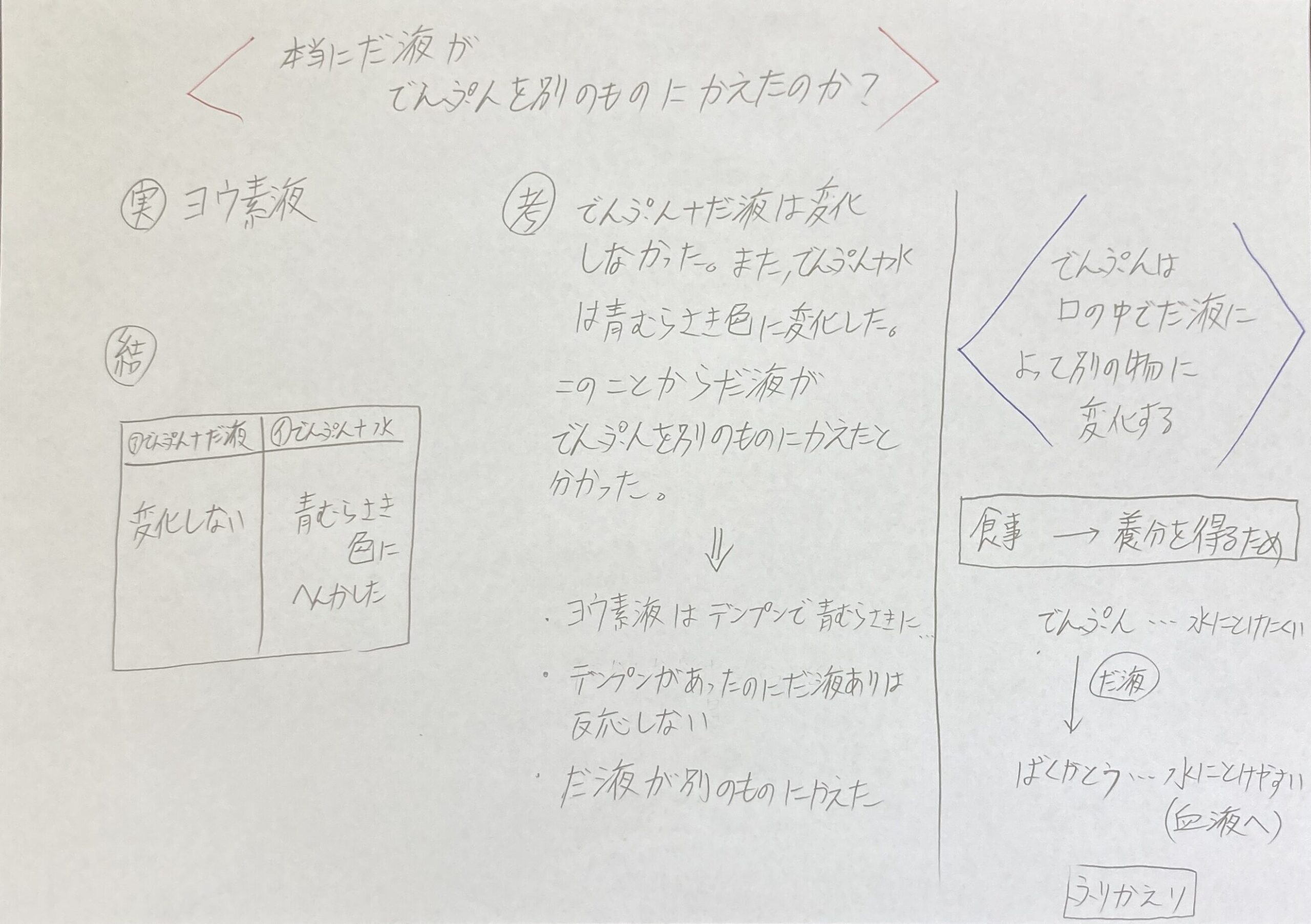 といって、本時のまとめとして、「でんぷんは口の中で唾液によって別のものに変化する」となりました。