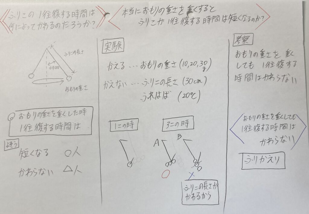 ということで、本日のまとめとして、「おもりの重さを変えても1往復する時間は変わらない」に決まりました。