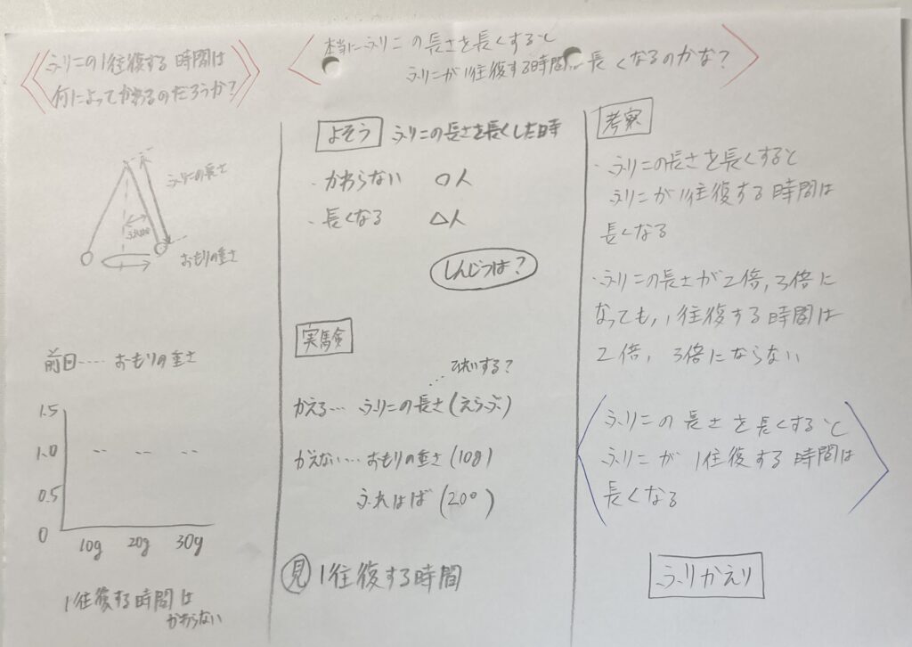 ということで、本日のまとめとして「ふりこのながさが長くなると、1往復する時間は長くなる。」に決まりました。