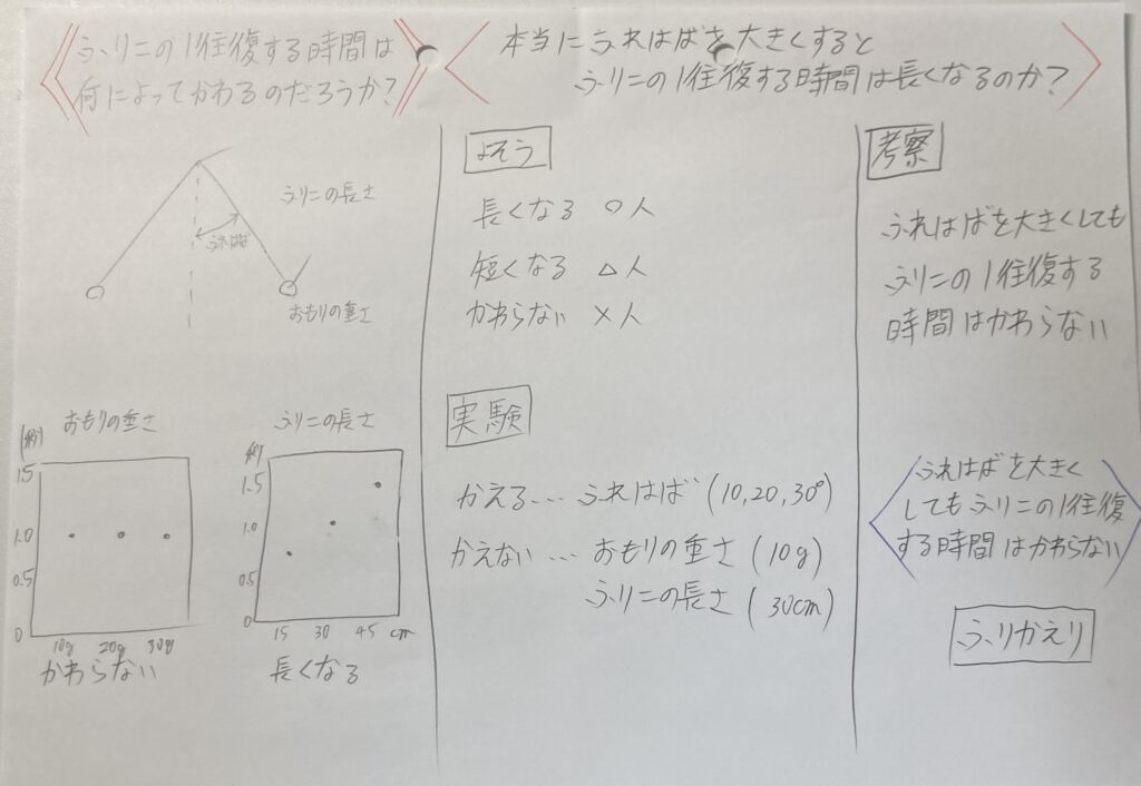 今回は、個別最適な学びはしませんでした。それは、ふれはばが大きくなりすぎると、1往復する時間が変わってくるからです。これは摩擦などの影響があるからだと思います。小学校の段階では、そこまで詳しいことはしないので、ここは個別最適な学びにして、みんなが混乱しないように配慮がいると思います。