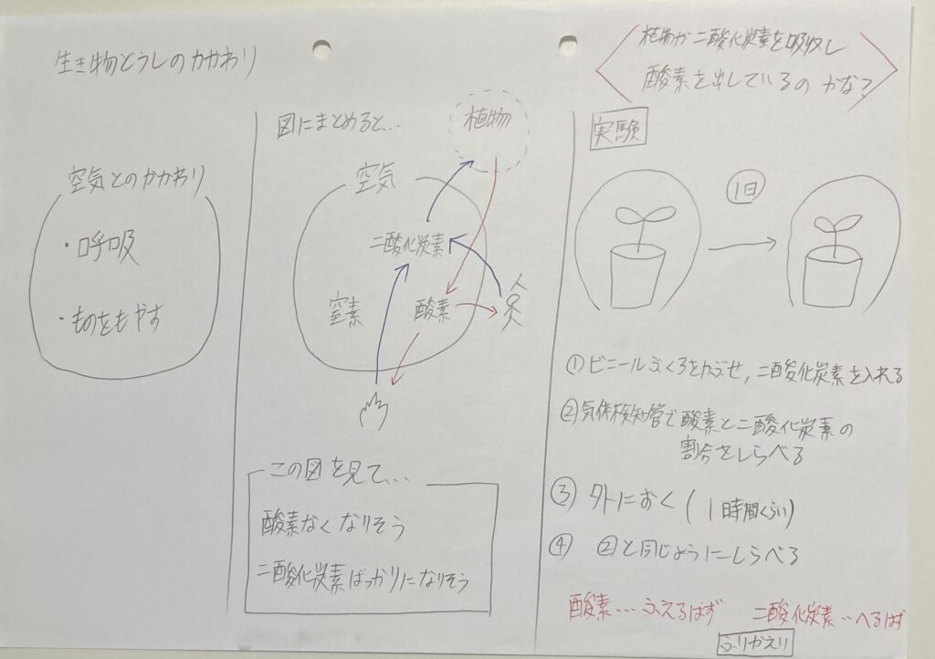ということで本時の課題として「植物が二酸化炭素を吸収し、酸素を出しているのかな?」にきまりました。