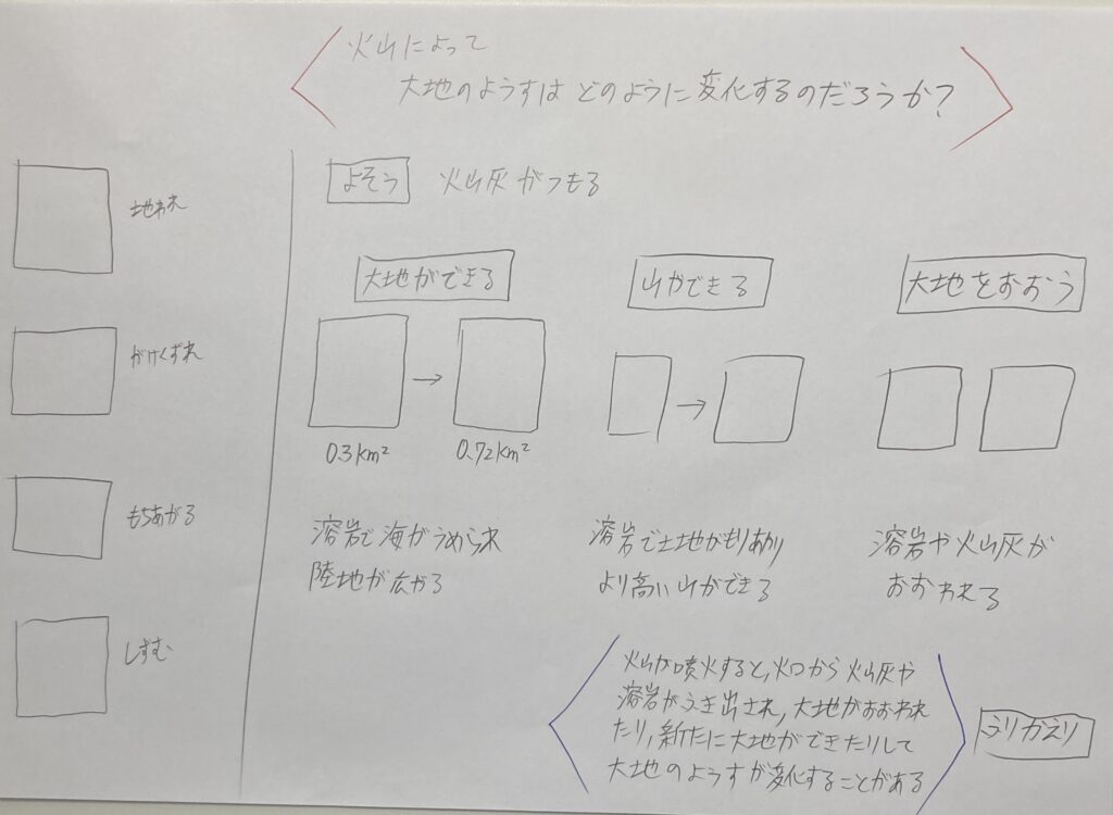 といって本時のまとめとして「火山が噴火すると、火口から火山灰や溶岩がふき出され、大地が覆われたり、新たに大地ができたりして、大地の様子が変化することがある」とまとめました。