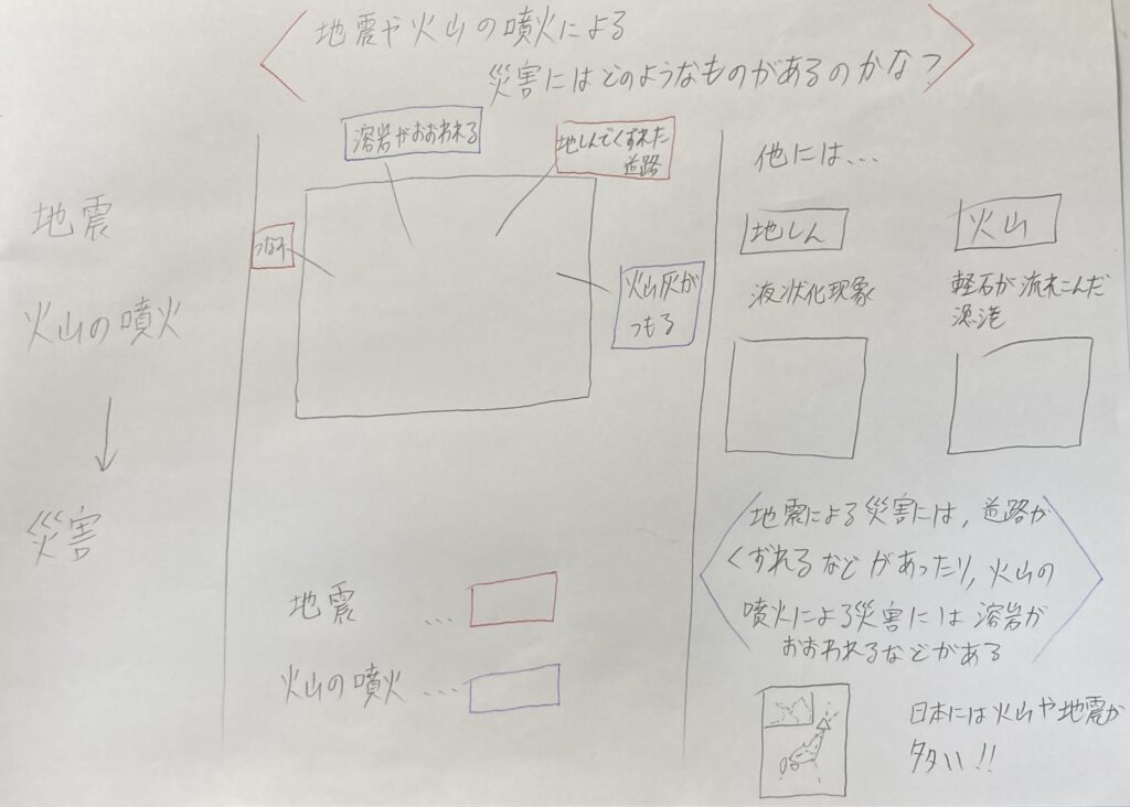 といって本時のまとめとして「地震による災害には、道路がくずれるなどがあったり、火山の噴火による災害には溶岩で覆われるなどがある」に決まりました