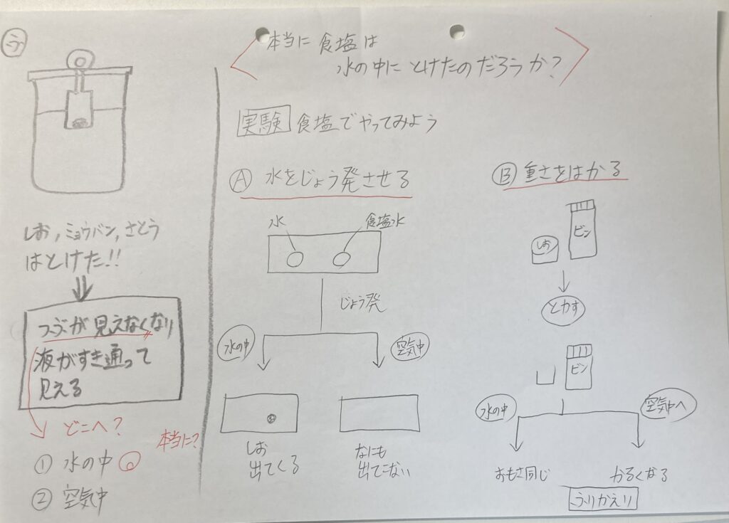 ということで本時の課題として、「本当に食塩は水の中にとけたのだろうか?」に決まりました。