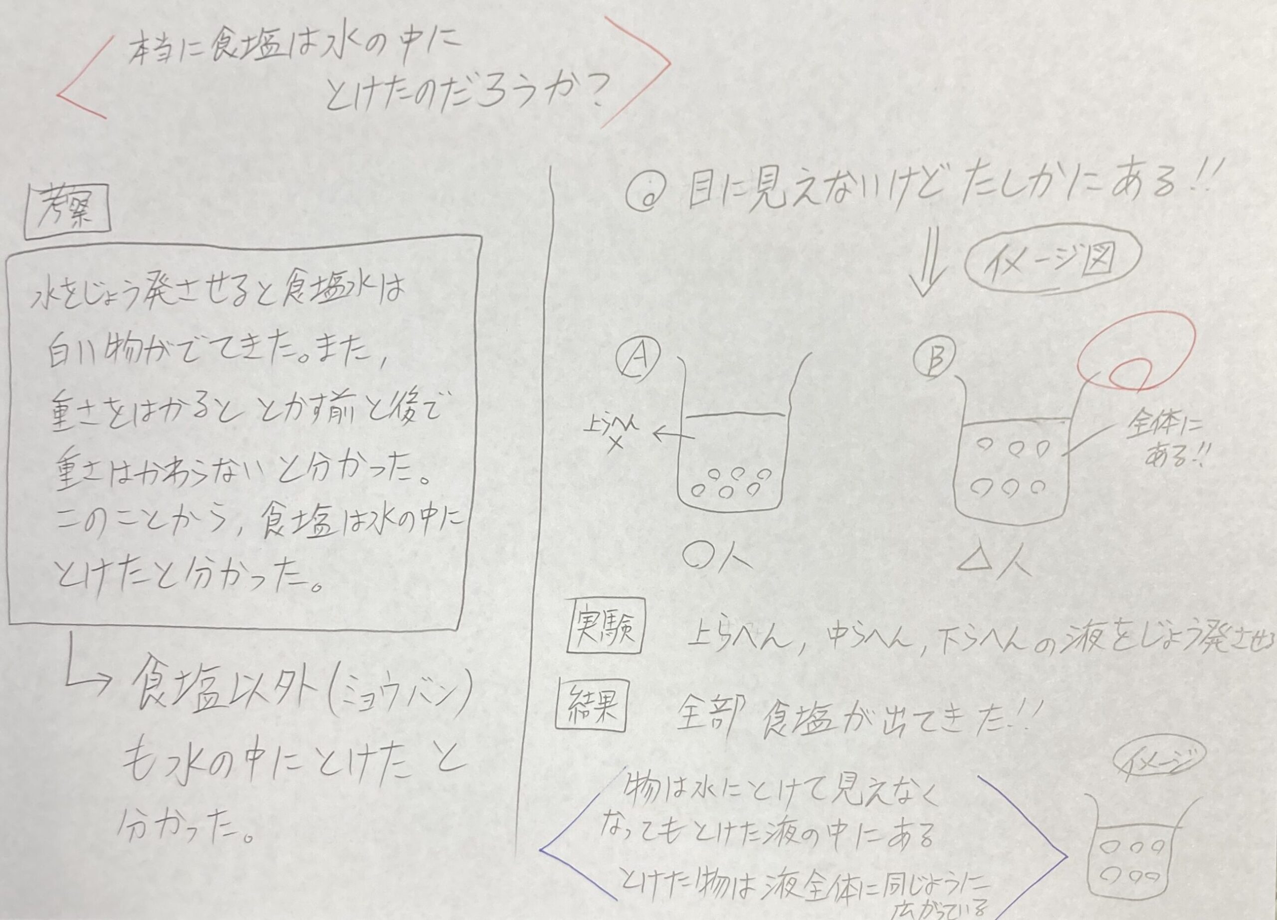 ということで、本時の課題として、「本当に食塩は水の中に溶けたのだろうか?」に決まりました。