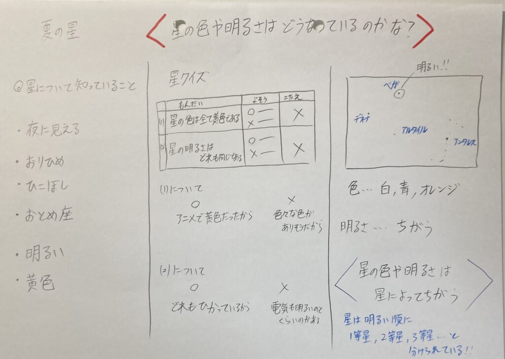 今日は、星の色や明るさに注目して学習をしました。子どもたちは、アニメや行事で星についてのイメージを形成していますが、それは必ずしも正しい科学的概念とは限りません。だからこそ、それを取り上げ、それに注目して学習することが大事なのだと思います。