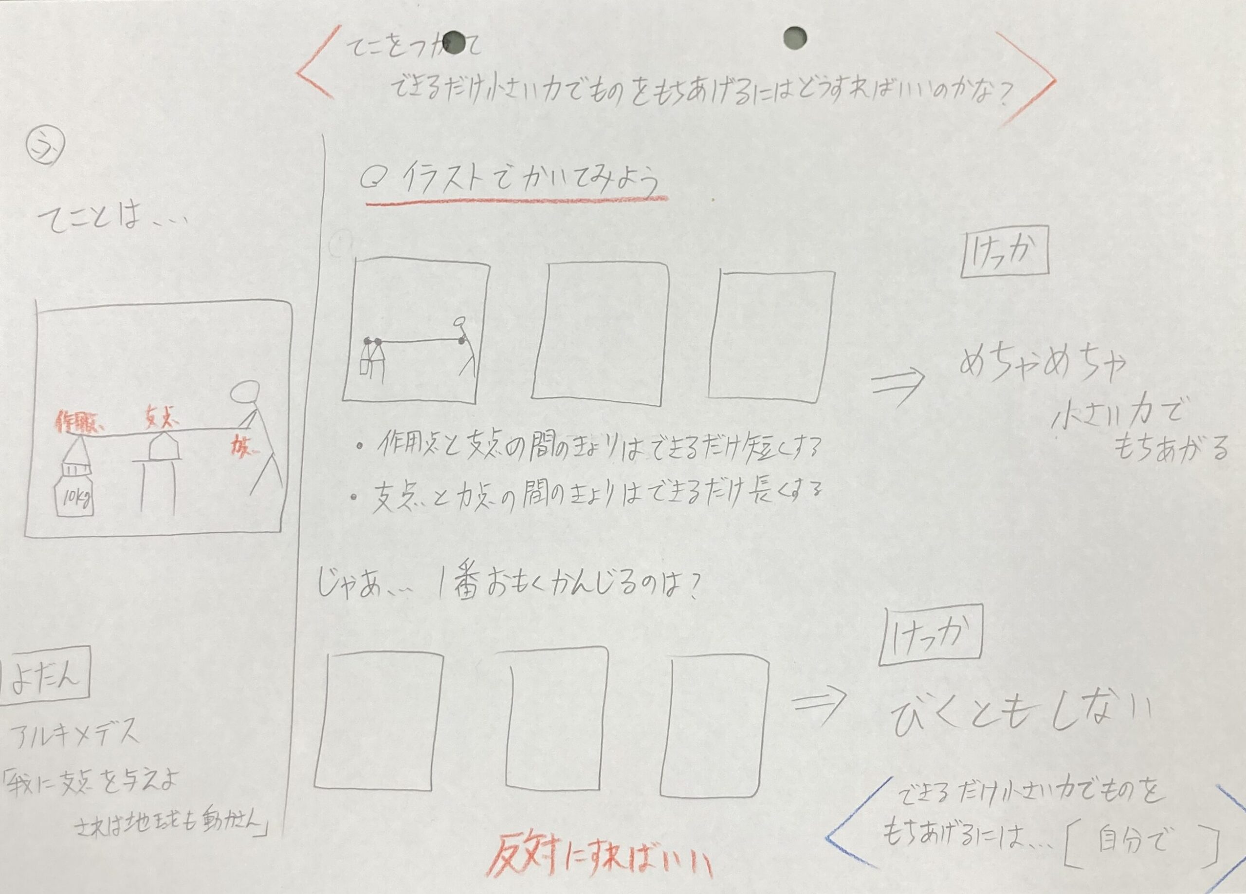 ということで本時のまとめとして、「支点と作用点の間の距離をできるだけ短くし、力点と支点の間の距離をできるだけ長くする」に決まりました