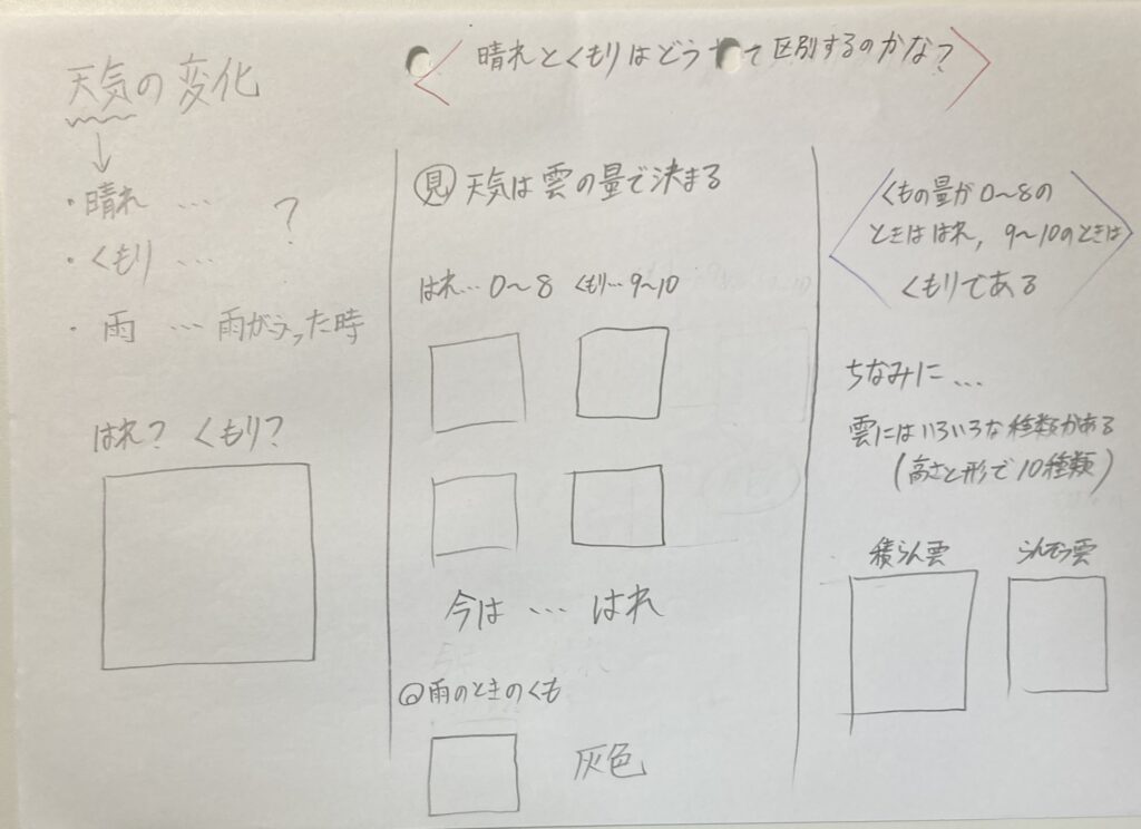 今日の授業でつけたい力は、それぞれの天気のとき、雲の様子がどうなのかを理解することです。雲の量や雲の色とかに気をつけながら、判断してくれたらいいなと思っていて、それがちゃんと落とせたと思います。