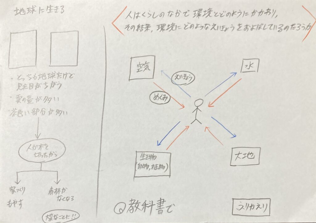 といって本時の課題として「人は暮らしの中で環境とどのようにかかわり、その結果、環境にどのようなえいきょうをおよぼしているのだろうか?」にきまりました。