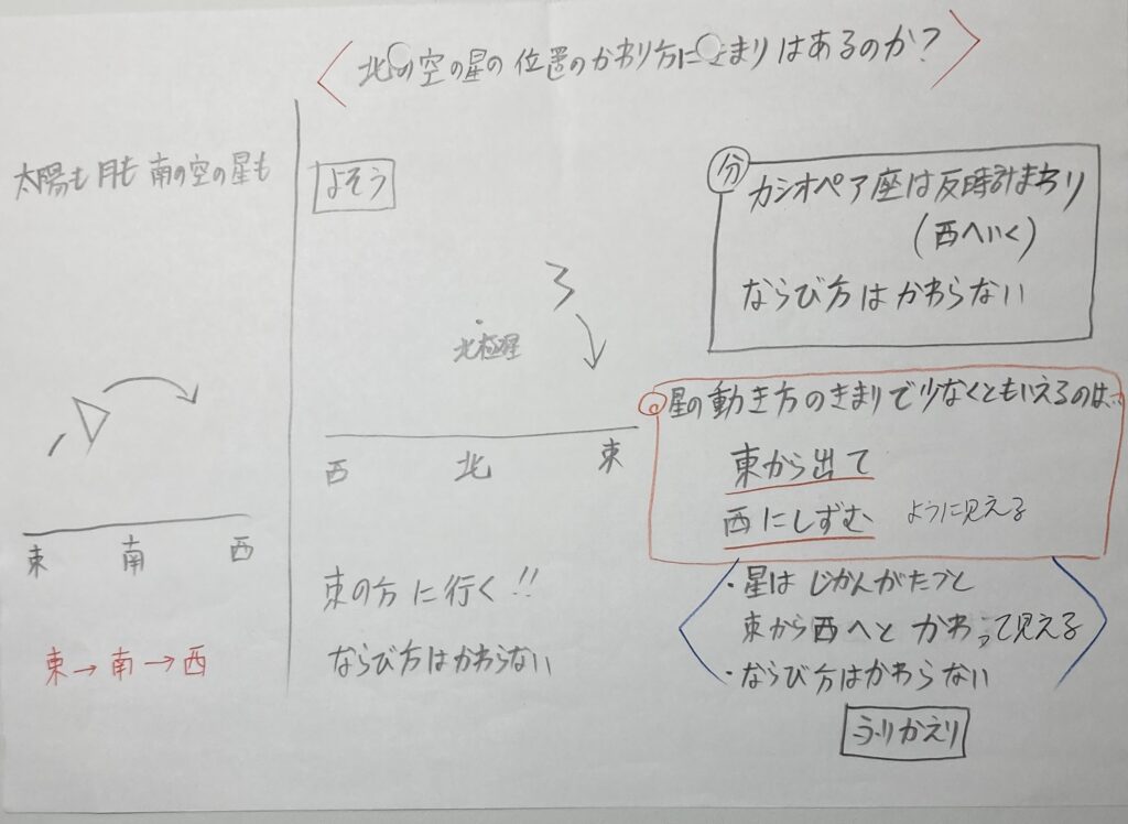 ということで本時の課題として、「北の空の星の位置の変わり方に決まりはあるのかな?」にきまりました。