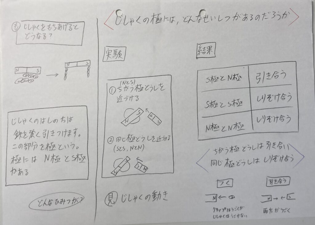 といって、本時のまとめとして「違う極同士は引き合い、同じ極同士はしりぞけあう」とかきました。